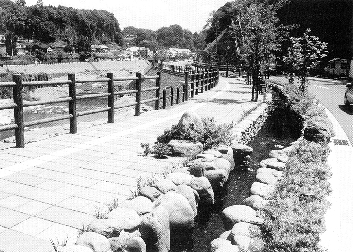 遊歩道沿いには水路が走る。7月7日は「川の日」。河川の魅力について理解と関心を深めてもらおうと、平成8年度に制定された。河川の持つ自然環境が「親水空間」として見直されつつある。自然はさまざまな恩恵を与えてくれる一方で、自然災害を引き起こす。それに対し、河川改修をはじめとする土木工事が施された。そこは、自然と人間が真剣に向き合う場所であり、自然を理解する場所である。