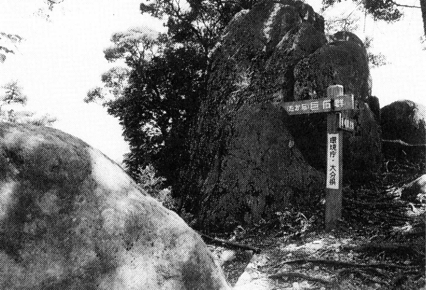 箭山神社付近の巨石群。中津市三光のシンボル八面山には、遊歩道が整備されている。修験の道探訪、自然と景勝の道探訪、自然と歴史の道探訪の3コース。ここに紹介する修験の道探訪コースは、一周約120分、イチイガシの林や滝、巨石群などが見所だ。