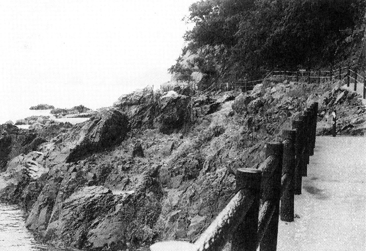 岩場の上を続くシーサイドプロムナード。かみうら天海展望台から海岸に降りると、岩場の上に遊歩道がつくられている。「シーサイドプロムナード」と呼ばれるこの遊歩道は、潮の香りを感じながらの222メートル。付近にはタイドプールが5ヶ所設けられ、磯辺の観察ができる。