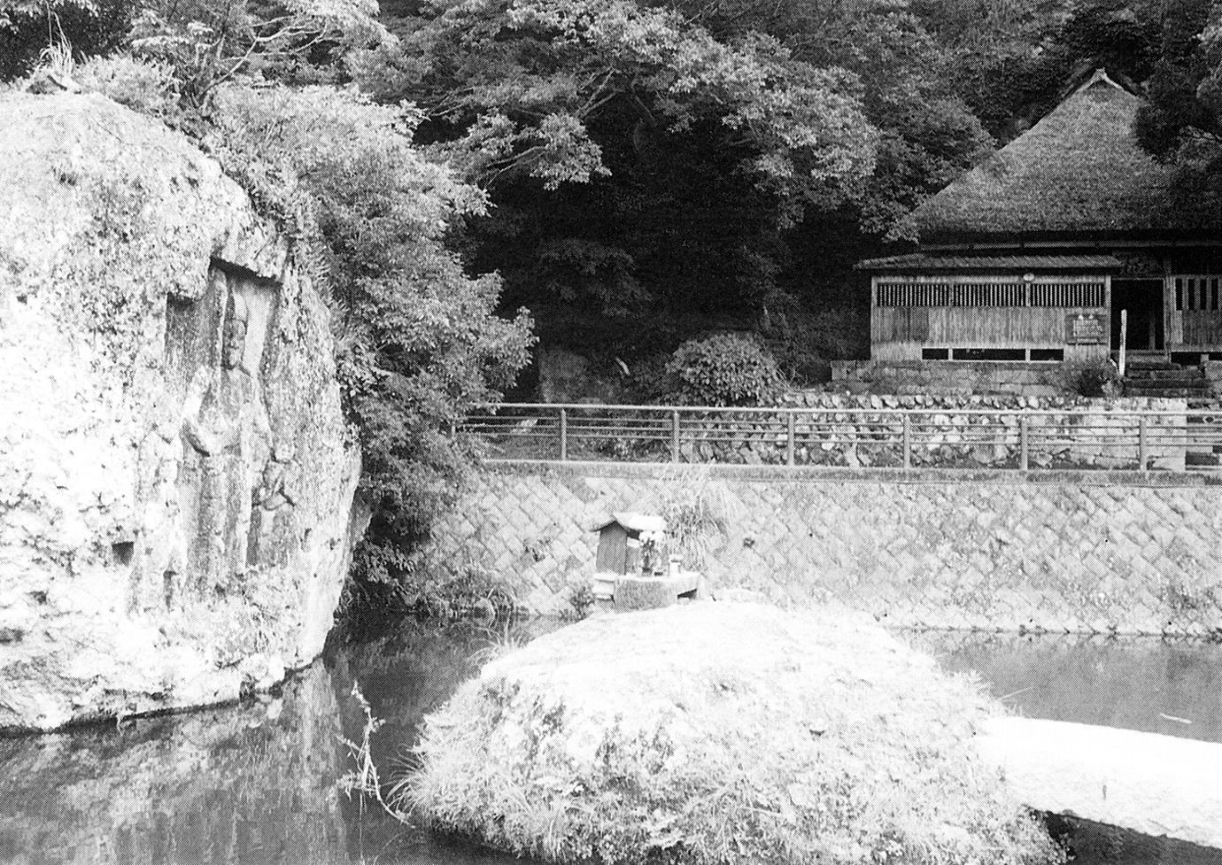 修正鬼会が開かれる天念寺の前を流れる小川には、川中不動がある。不動明王立像など不動三尊の刻まれた岩がたっている。