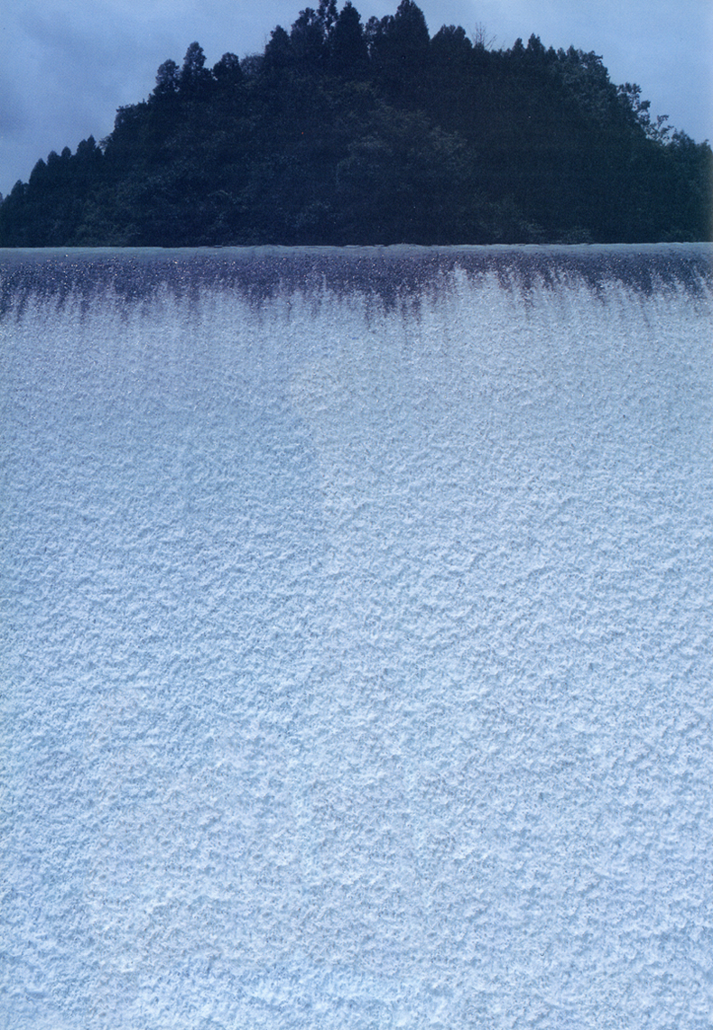 “白水”の名のとおり、堰堤一面を滑らかに流れ落ちる水は、白いカーテンだ。水は白い泡となり、細かなしぶきは陽光を受けてキラキラと輝く。白水貯水池は、竹田市と荻町の境を流れる大野川上流の大谷川に造られ、竹田市と緒方町の八地区約310ヘクタールの水田、畑地を潤す富士緒井路の貯水池として建設された。1個1個積み上げられた石が見事な曲線を描き、オーバーフローする水がすばらしい幾何学模様を描くのである。