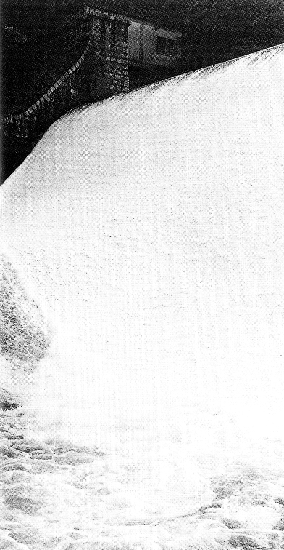 “白水”の名のとおり、堰堤一面を滑らかに流れ落ちる水は、白いカーテンだ。水は白い泡となり、細かなしぶきは陽光を受けてキラキラと輝く。白水貯水池は、竹田市と荻町の境を流れる大野川上流の大谷川に造られ、竹田市と緒方町の八地区約310ヘクタールの水田、畑地を潤す富士緒井路の貯水池として建設された。1個1個積み上げられた石が見事な曲線を描き、オーバーフローする水がすばらしい幾何学模様を描くのである。右岸は大きく堤本体と同じ高さに反り返し、中央に向かって末広がりに水を導いている。水がダイナミックな円弧を描き流れ込む様は男性的である。