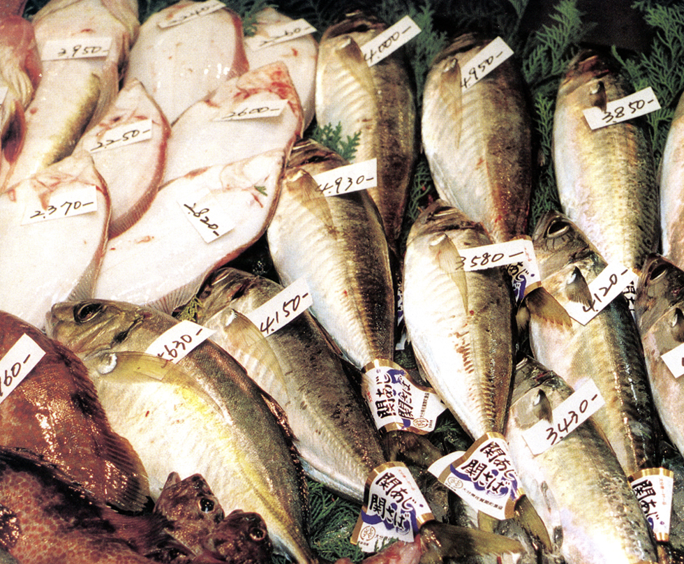 ところ狭しと並ぶ県産魚の数々。(平成9年、大分市内のデパートにて)。大分県は、北に遠浅の干潟、南にリアス式海岸を持つ。豊後水道の急潮、沿岸を洗う黒潮とさまざまな自然条件が織りなす豊かな海からは、アジ、サバをはじめ、カレイ、フグ、車エビなど豊富な海の幸が生み出されている。