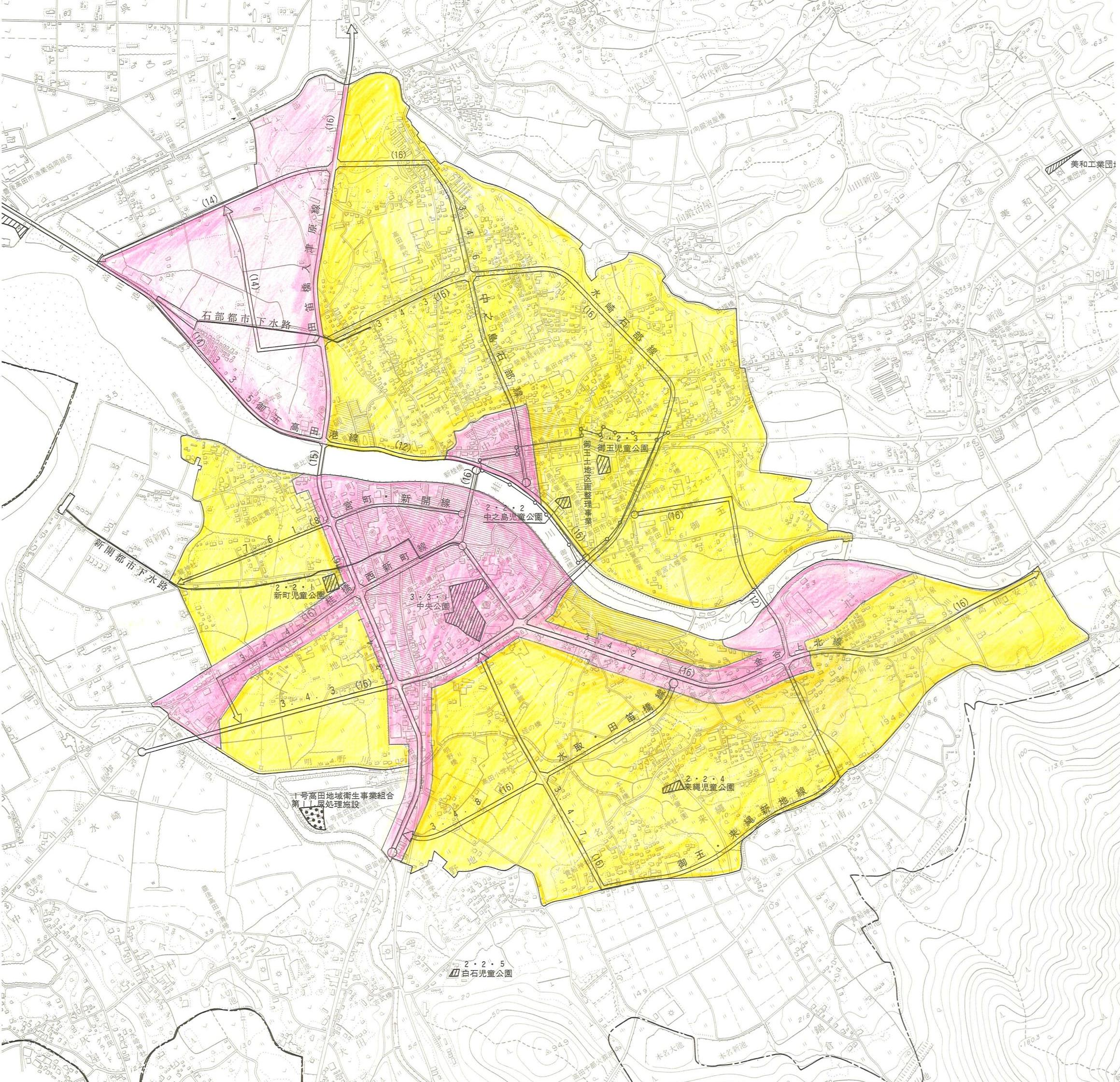 第1種区域:黄色 第2種区域:桃 赤 - 特定建設作業の規制