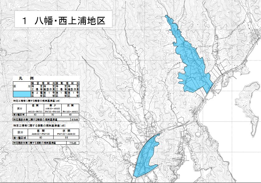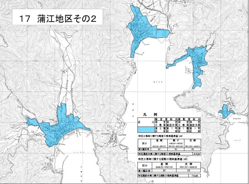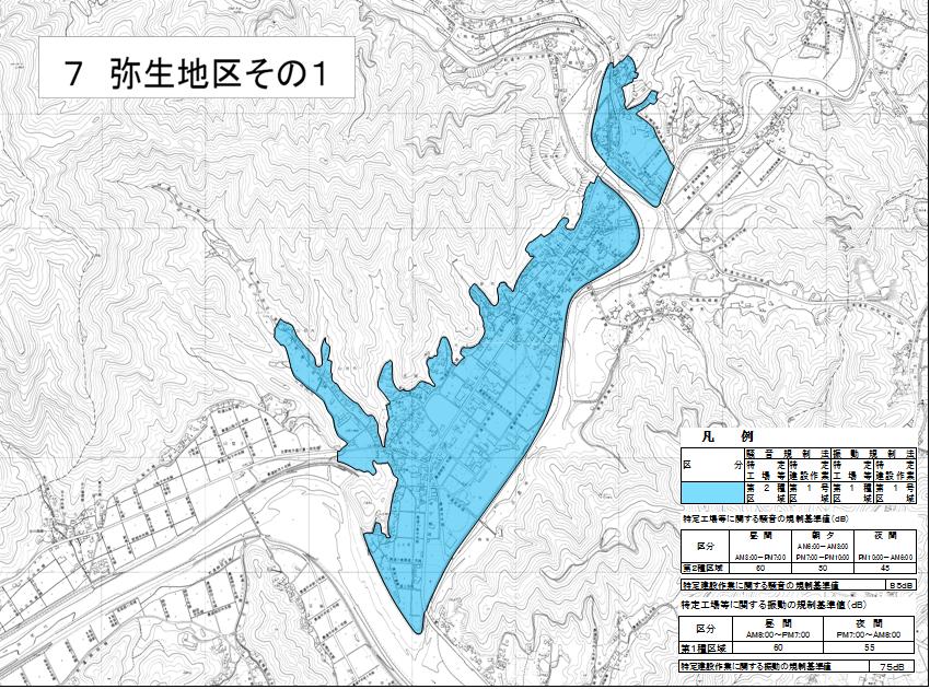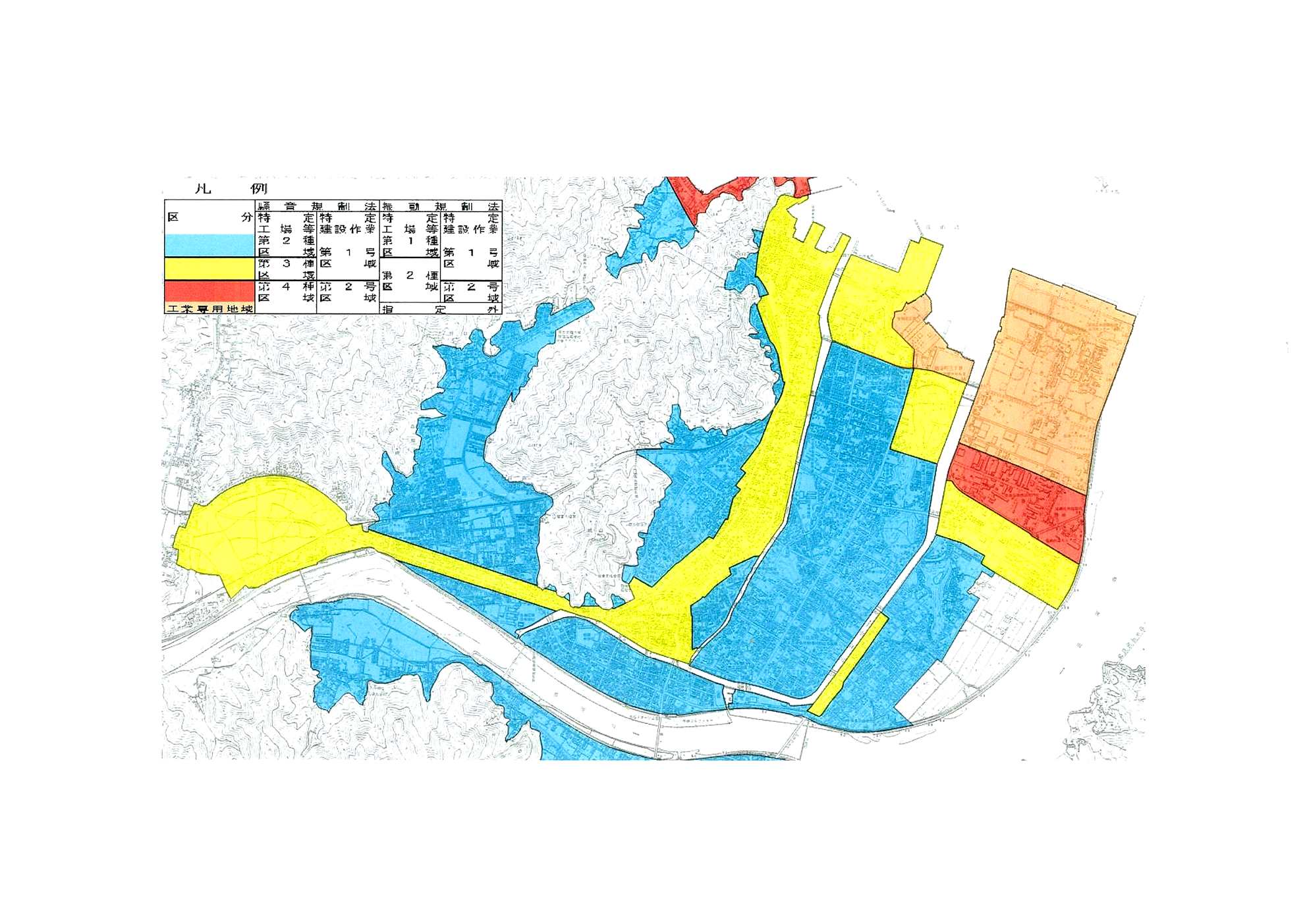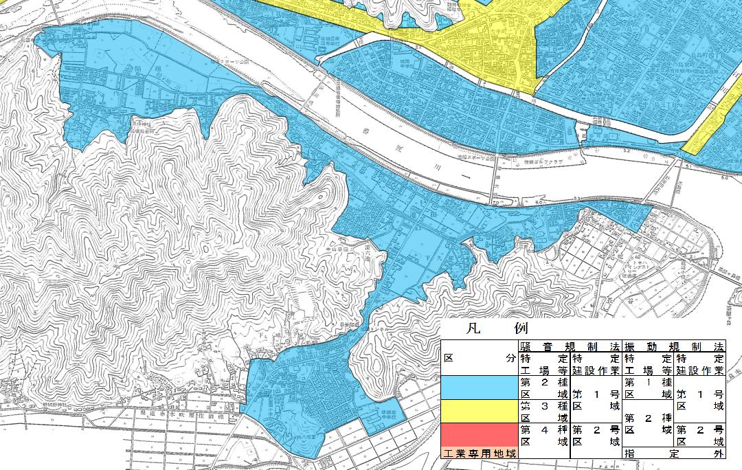第1種区域:青色 第2種区域:黄色 赤 - 特定建設作業の規制